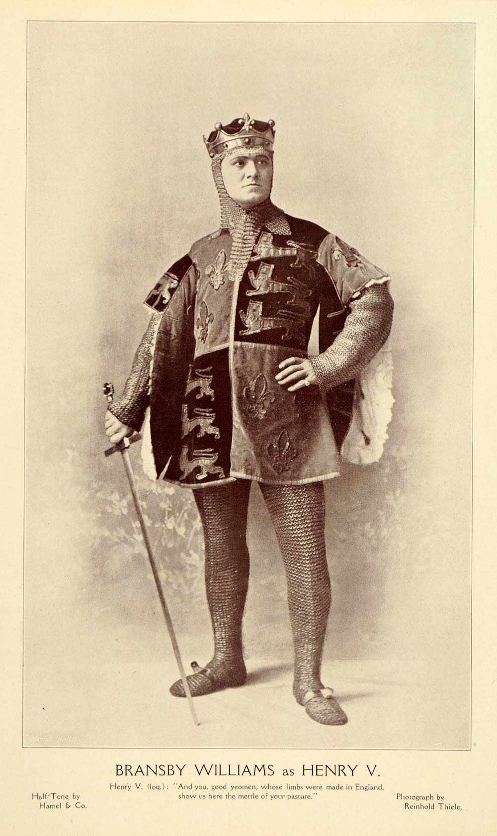 This is an original 1907 halftone print portrait of British actor, Bransby Williams (1870-1961) in his role as King Henry V in the William Shakespeare play, from a photograph by Reinhold Thiele. Halftone by Hamel & Co.