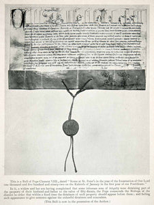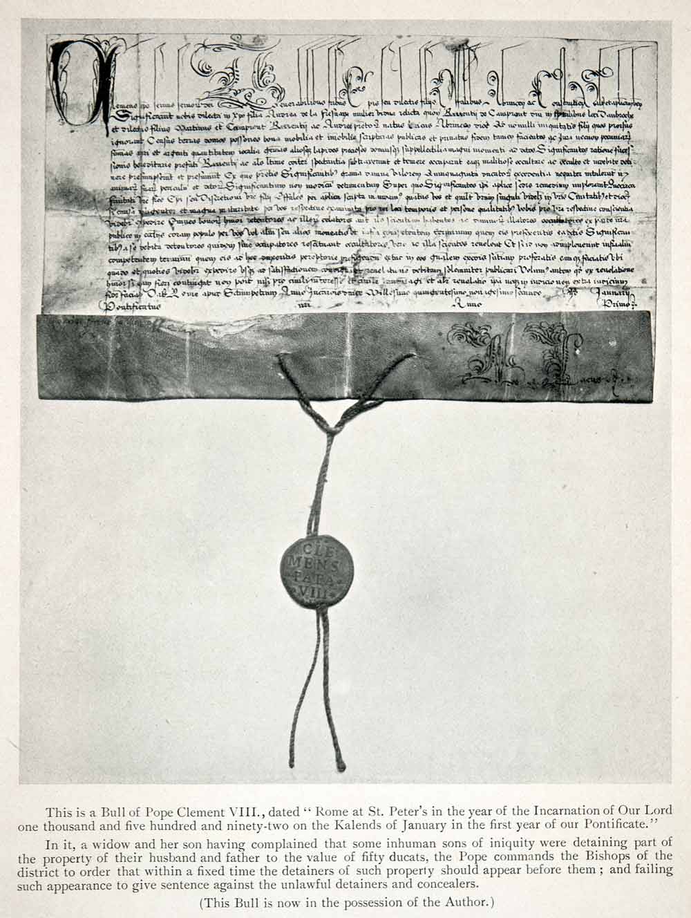 This is an original 1907 black and white halftone print of a Bull of Pope Clement VIII and is dated as "Rome at Saint Peter's in the year of the Incarnation of Our Lord one thousand and five hundred and ninety-two on the Kalends of January in the first year of our Pontificate."
