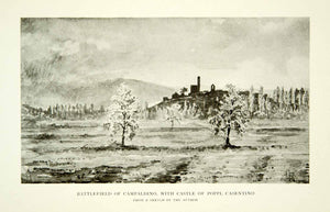 This is an original 1907 black and white halftone print that depicts the battlefield of Campaldino, with Poppi Castle visible in the distance.