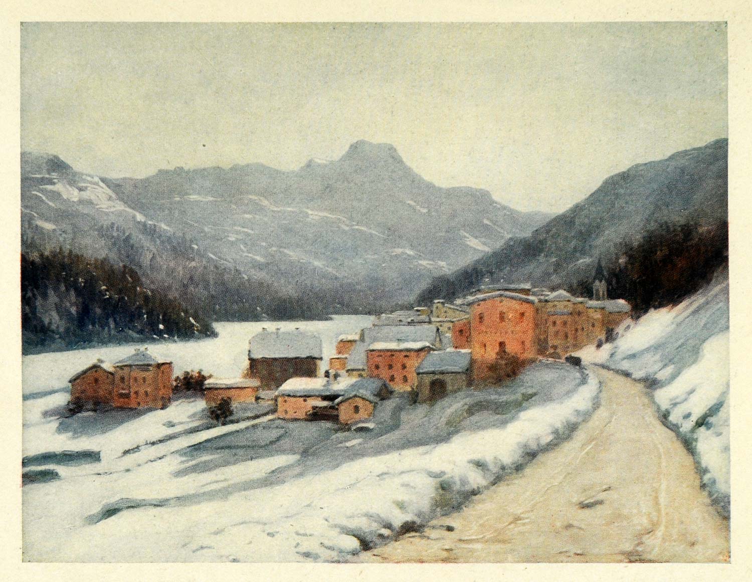 This is an original 1907 color print of Kampfer, Switzerland (die Schweiz). Shown in the background are the mountains of the region.