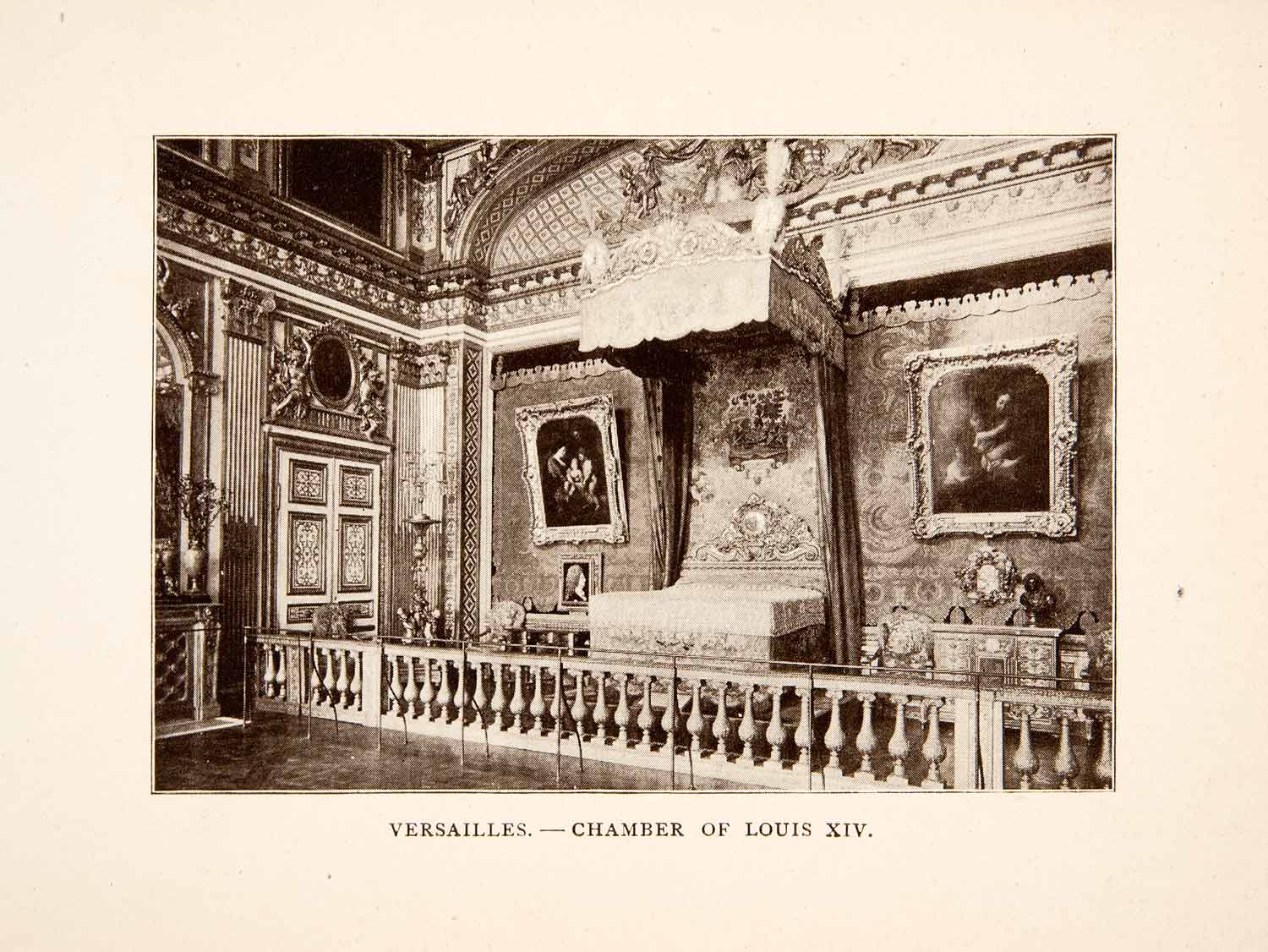 This is an original 1907 black and white halftone print of the chambers of King Louis XIV at Versailles, France.