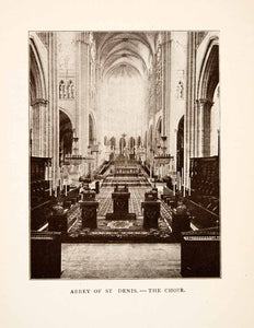 This is an original 1907 black and white halftone print of the choir areas of the Abbey of Saint Denis in Paris, France.
