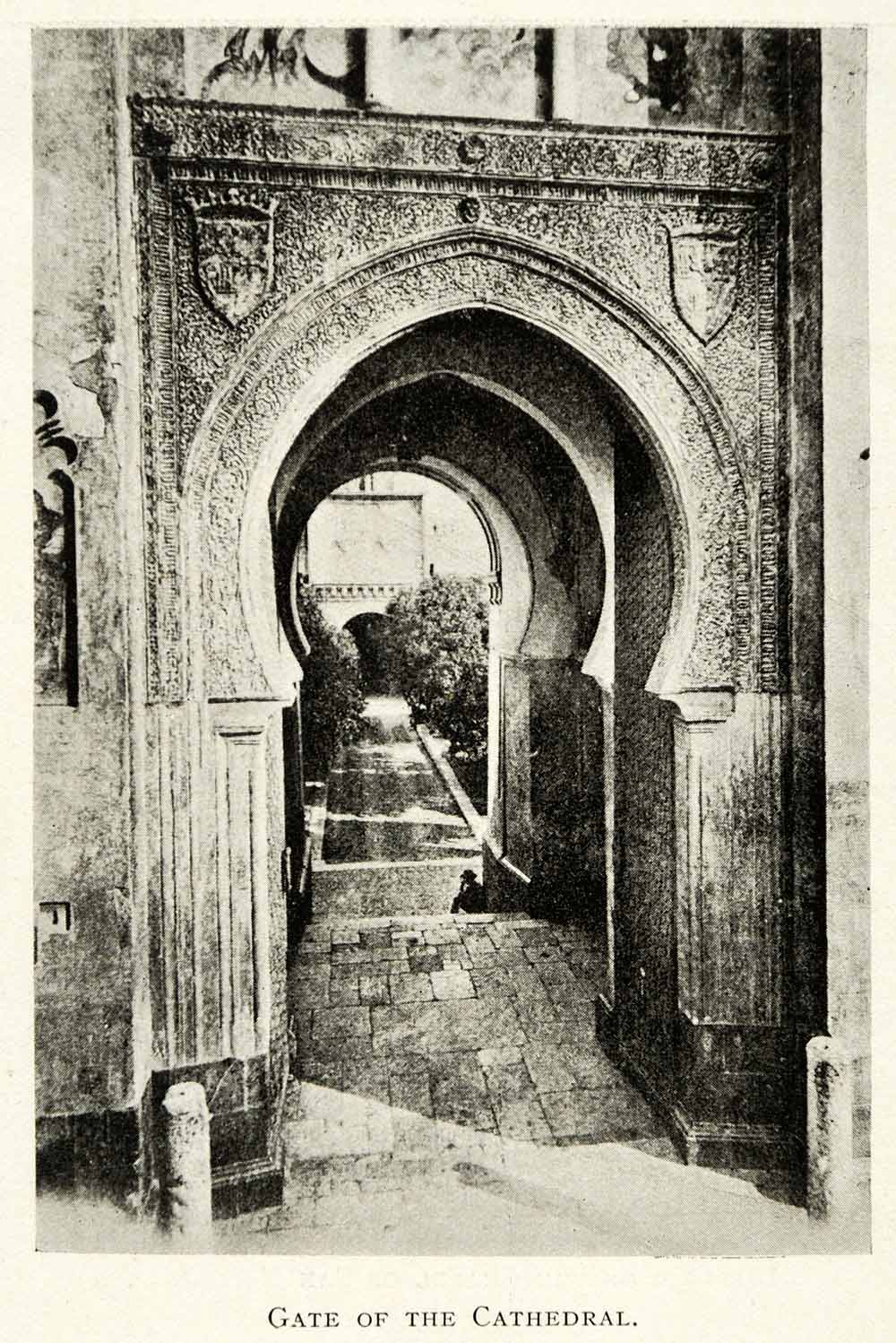This is an original 1907 black and white halftone print of the gate of a Cathedral in Cordova, Spain.