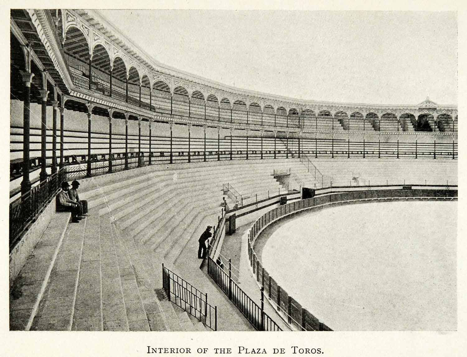 This is an original 1907 black and white halftone print of the interior of the Plaza de Toros de Ronda in Cordova, Spain.