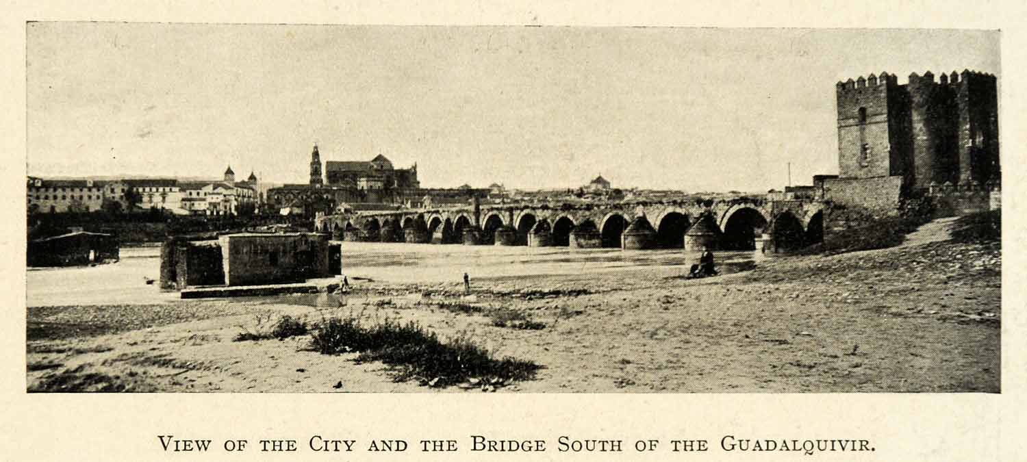 This is an original 1907 black and white halftone print of the bridge that crosses the Guadalquivir River in Cordova, Spain.
