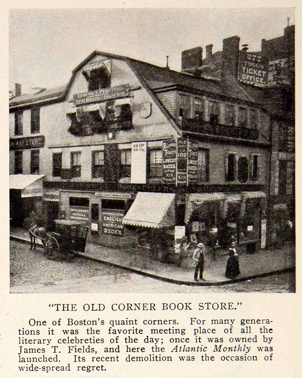 This is an original 1907 black and white halftone print of "The Old Corner Book Store," in Boston, Massachusetts.