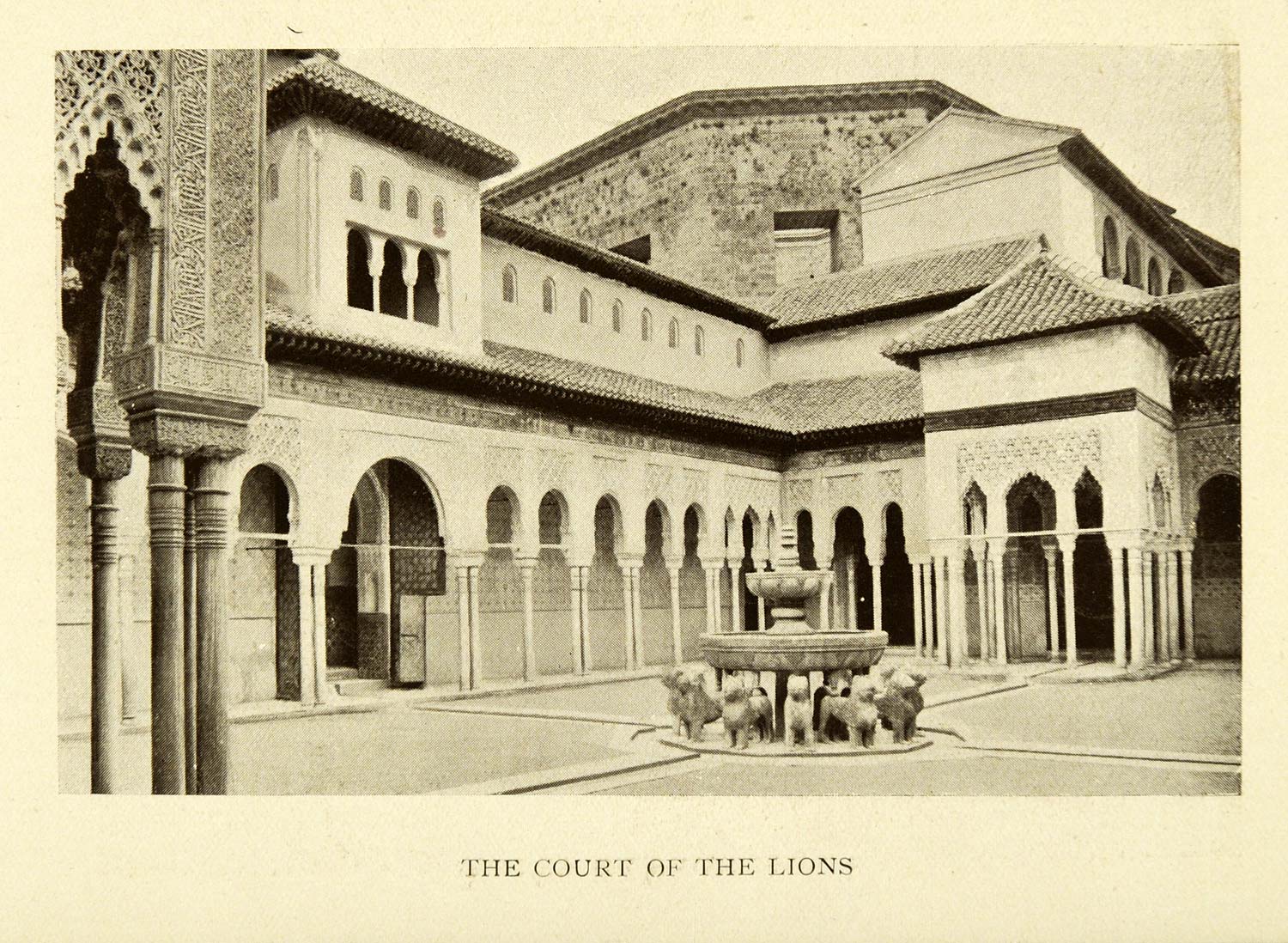 This is an original 1907 halftone print of The court of the Lions in Alhambra in Granada, Spain.
