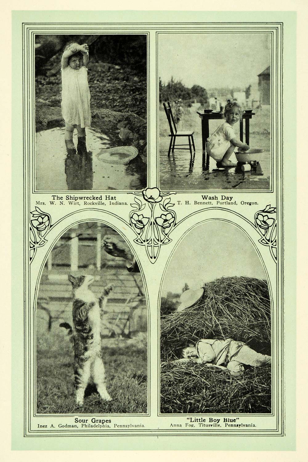 This is an original 1907 color print featuring creative photographs of children by Mrs. W. N. Wirt, Rockville, Indiana; T. H. Bennett, Portland, Oregon; and Anna Fog, Titusville, Pennsylvania.