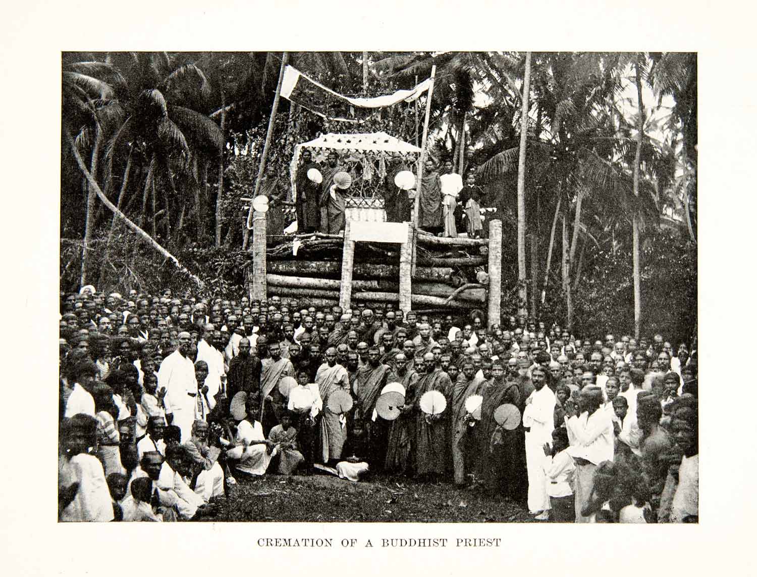 This is an original 1907 black and white halftone print of the cremation of a Buddhist Priest.