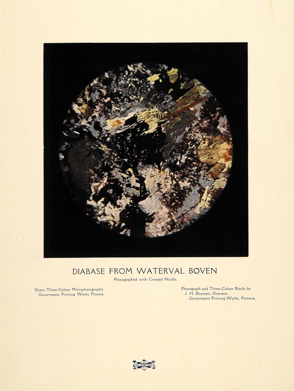 This is an unusual, original 1907 three-color print of a diabase rock from Waterval Boven, a small town in South Africa. Direct three-color microphotography, Government Printing Works Process. Photograph and three-color blocks by J. H. Booysen, Overseer, Government Printing Works, Pretoria.