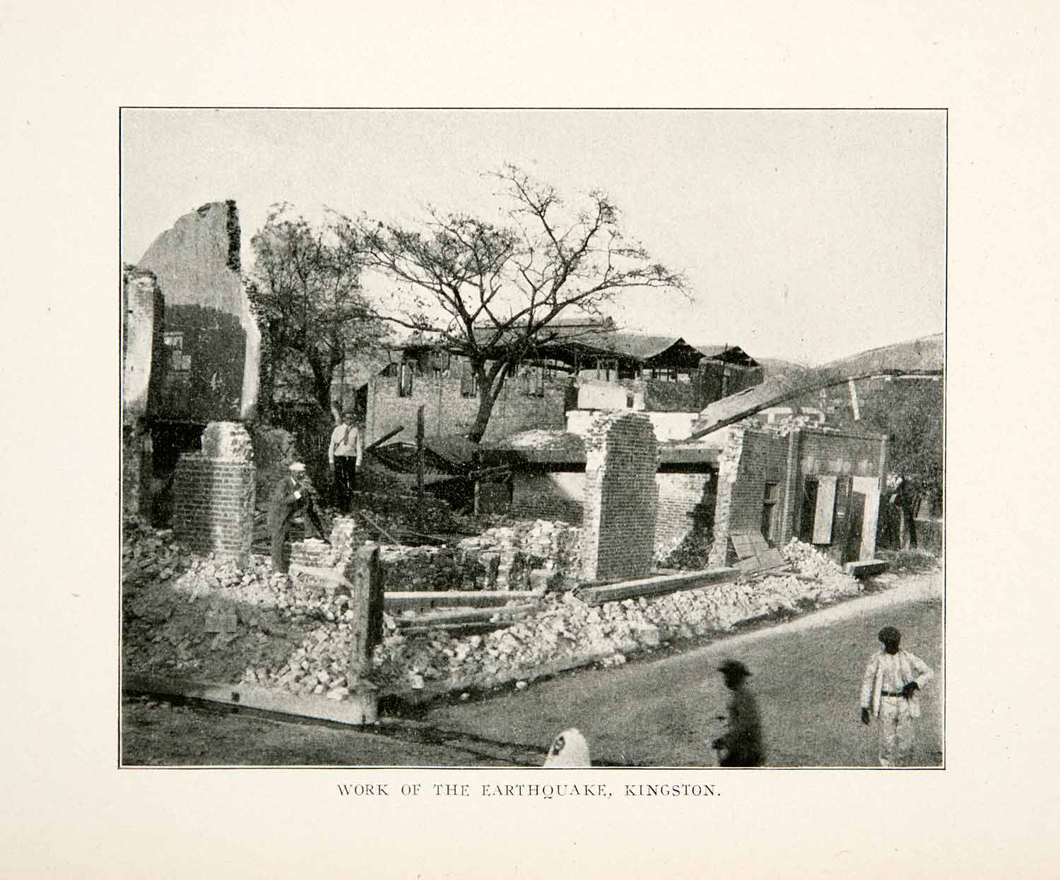 This is an original 1907 black and white halftone print of the aftermath of an earthquake that hit Kingston, Jamaica, in 1907. It registered a magnitude of a 6.5.