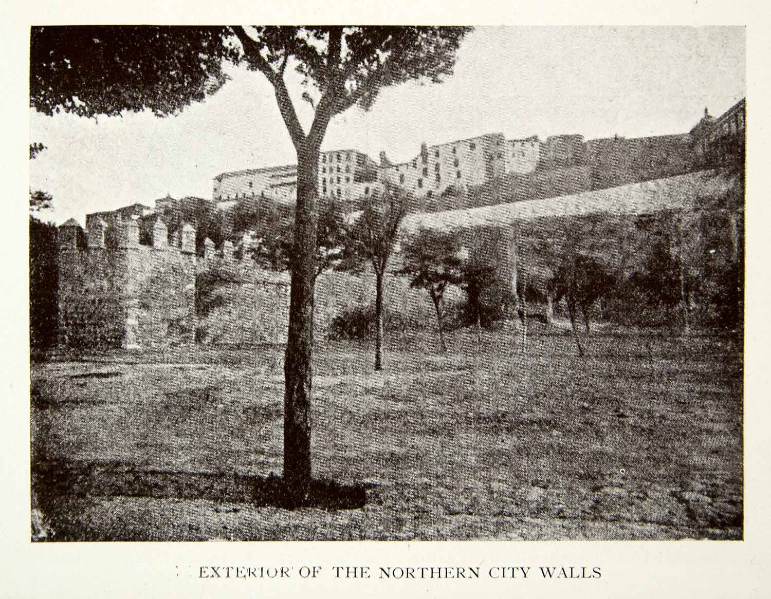 This is an original 1907 black and white halftone print of the exterior of the northern city walls of Toledo, Spain.