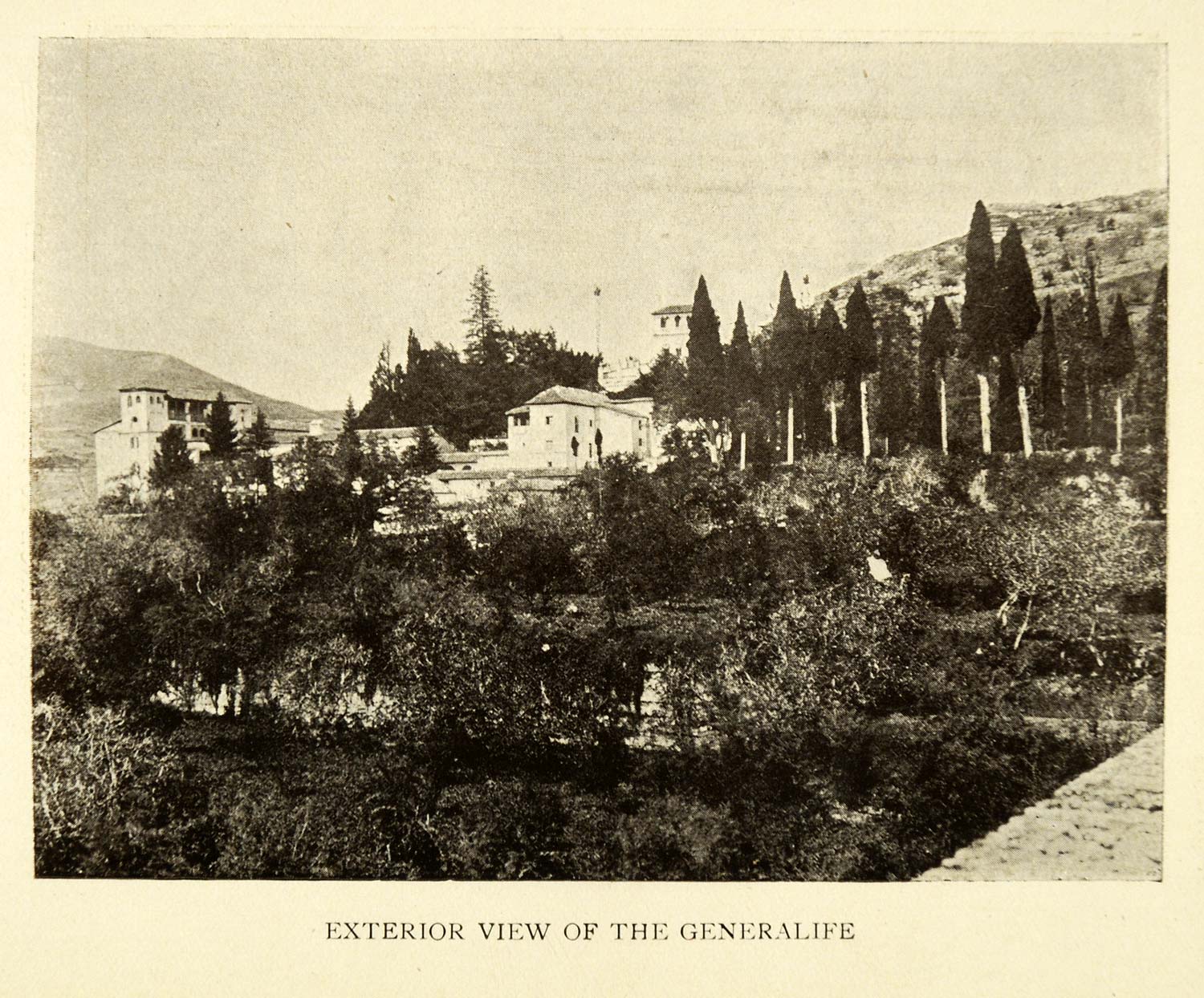This is an original 1907 halftone print of the Exterior View of the Generalife in Granada, Spain.