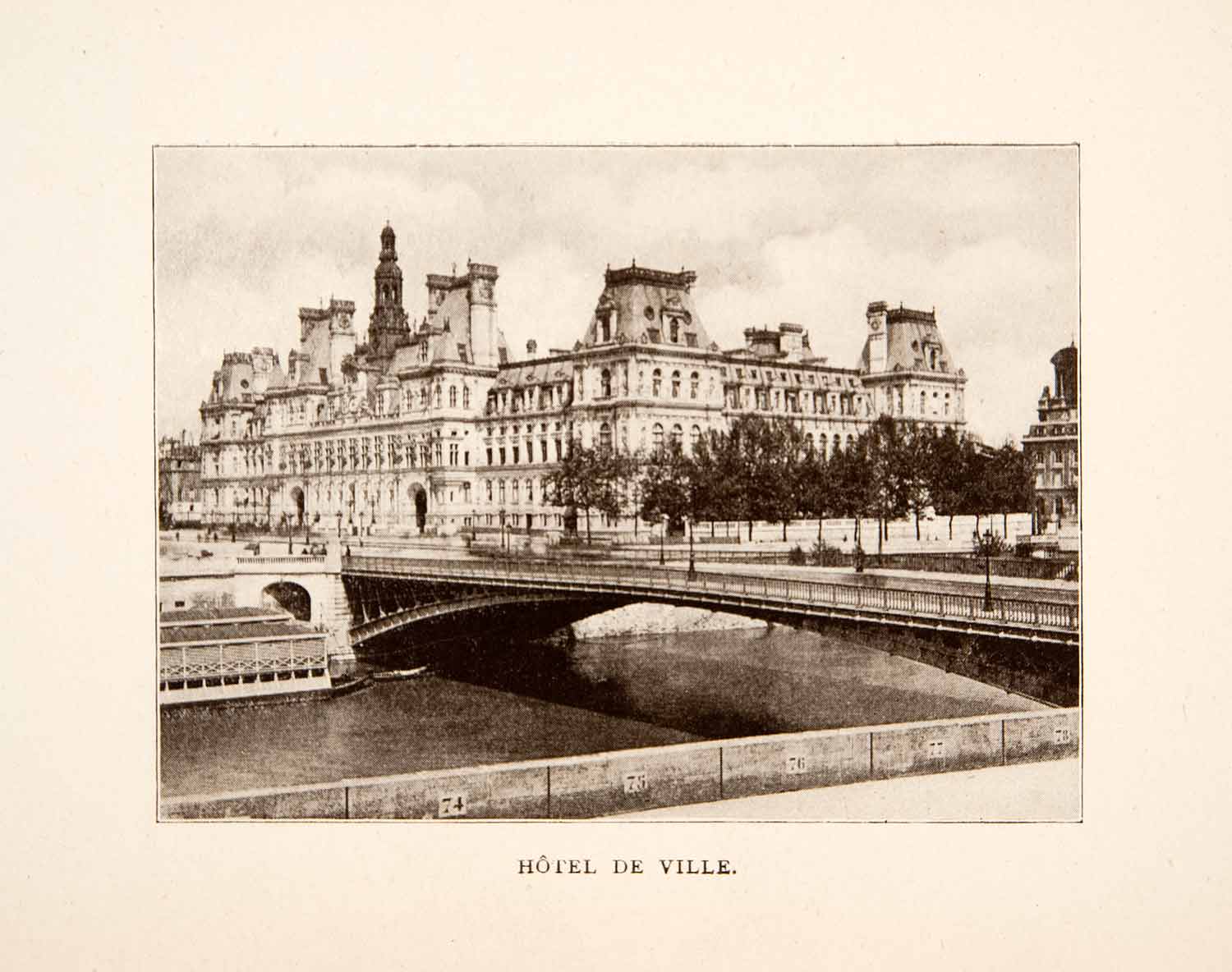 This is an original 1907 black and white halftone print of the Hotel de Ville in Paris, France.