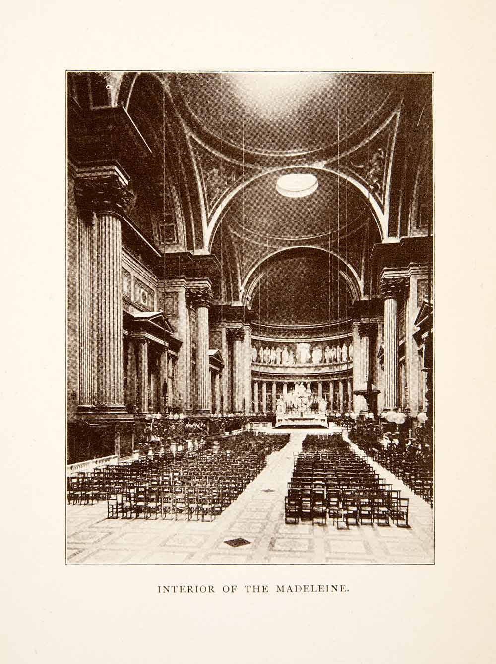 This is an original 1907 black and white halftone print of the interior of the Madeleine in Paris, France. This church is dedicated the Saint Mary Magdalene and was designed as a classical temple to the glory of Napoleon's army.