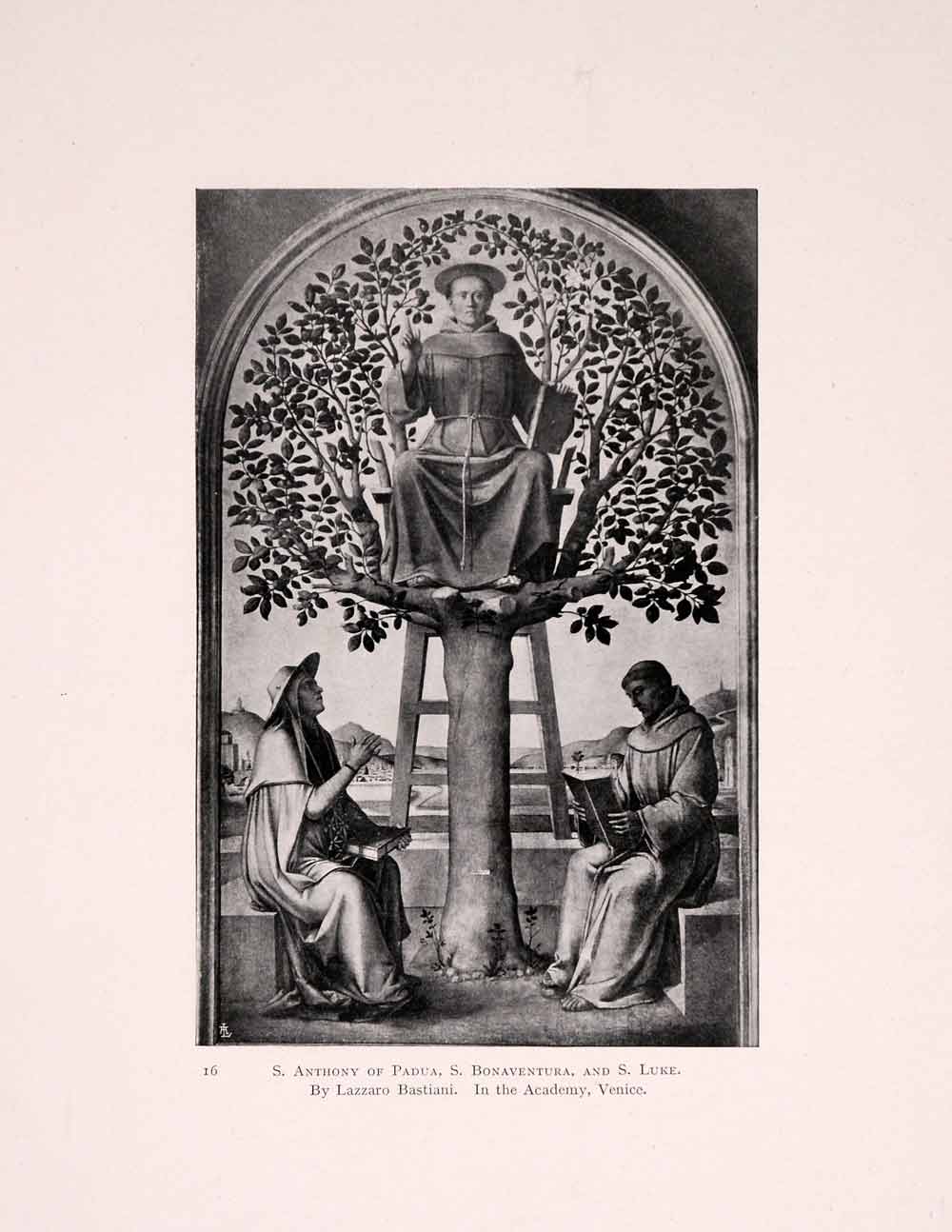 This is an original 1907 halftone print of a simple piece by Italian Renaissance artist Lazzaro Bastiani, which depicts Saint Anthony of Padua, Saint Bonaventura and Saint Luke.
