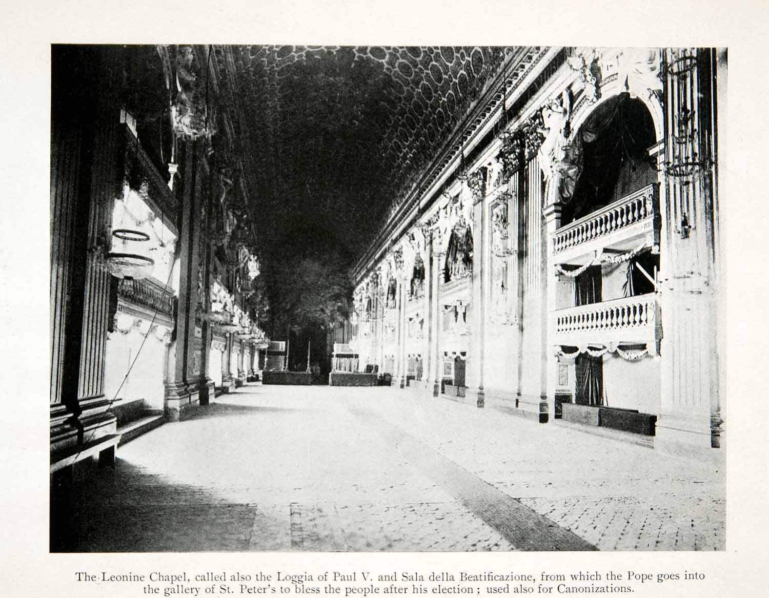 This is an original 1907 black and white halftone print of the Leonine Chapel (Loggia of Paul V) and Sala della Beatificazione, from which the Pope goes into the gallery of Saint Peter's to bless people after his election.