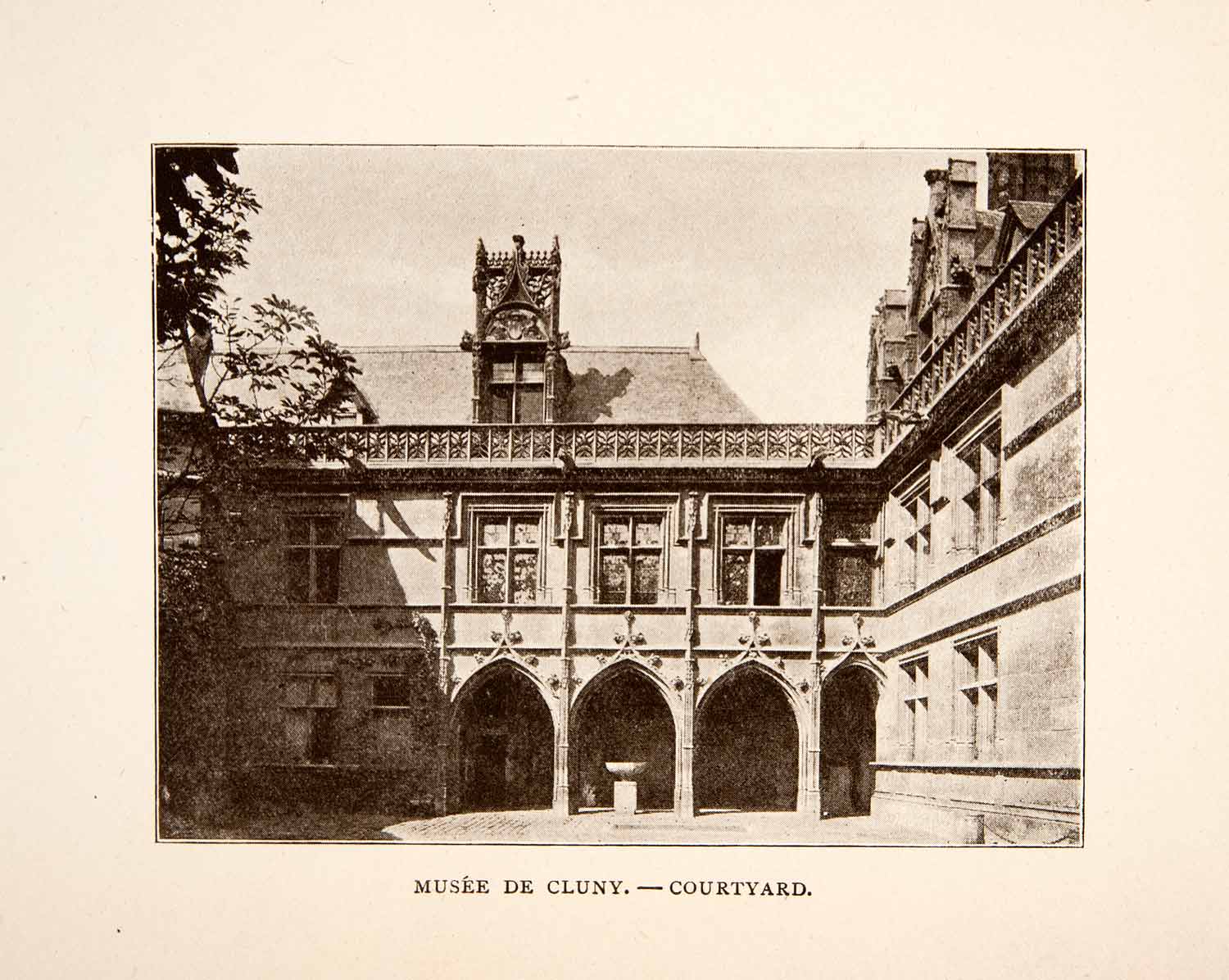 This is an original 1907 black and white halftone print of the courtyard at the Musée de Cluny in Paris, France.