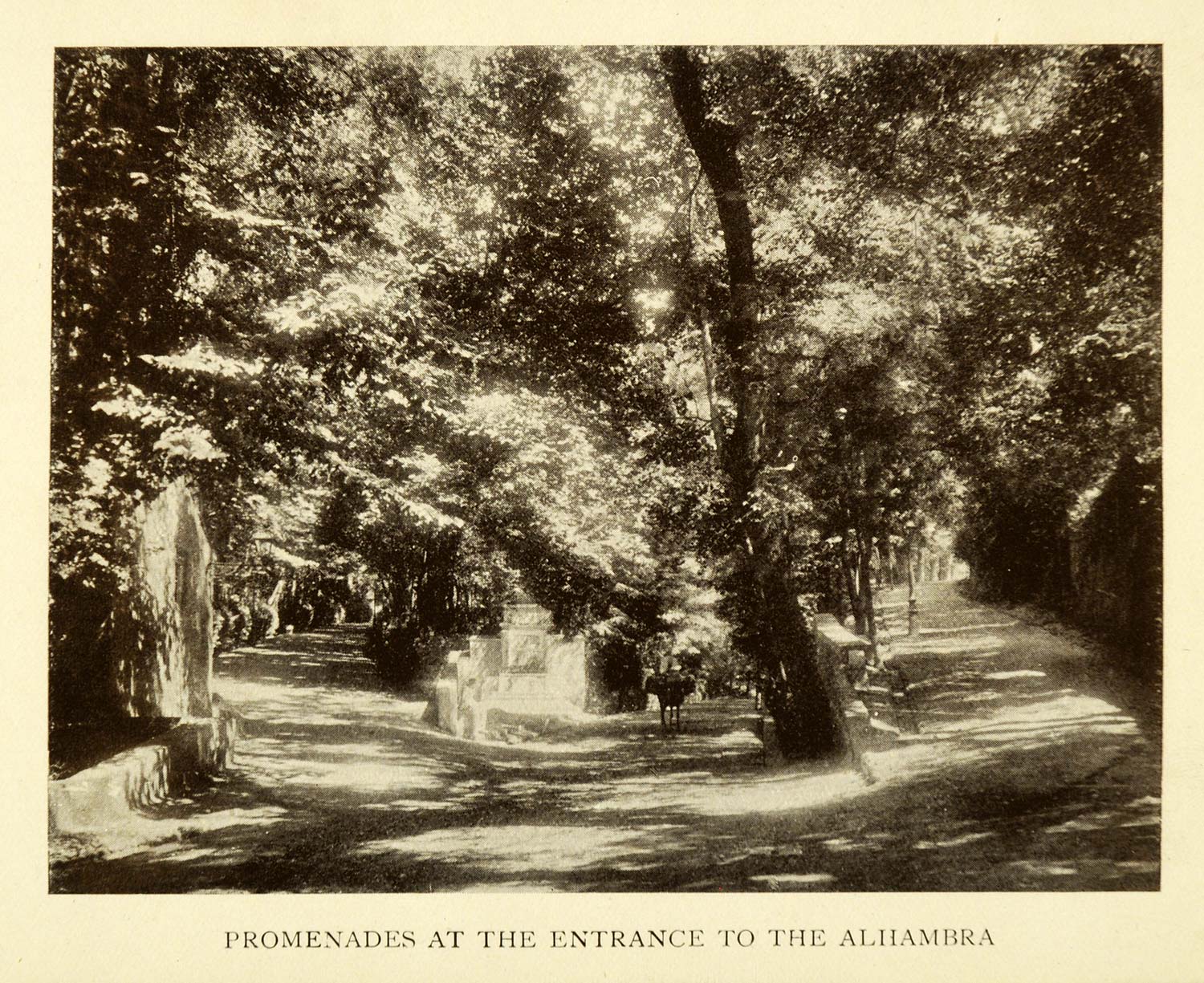 This is an original 1907 halftone print of the Promenades at the Entrance to the Alhambra Palace in Granada, Spain.