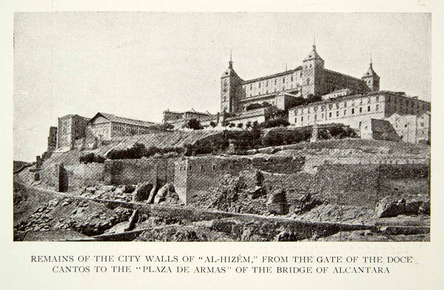 This is an original 1907 black and white halftone print of the remains of the city walls of Al-Hizém, as seen from the gate of the doce cantos to the Plaza de Armas of the bridge of Alcantara in Toledo, Spain.