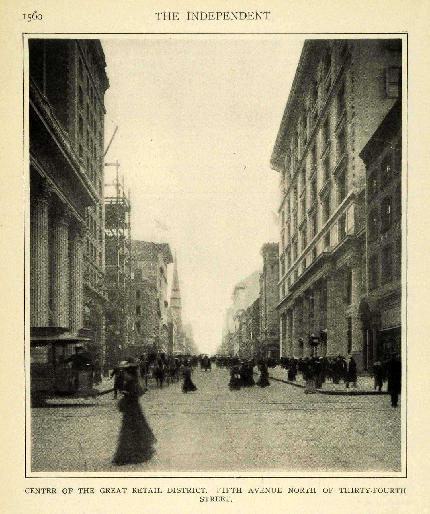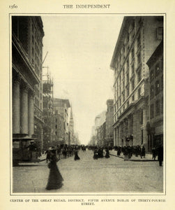 This is an original 1907 halftone print of the center of the retail district, located at Fifth Avenue, North of 34th Street in New York City.