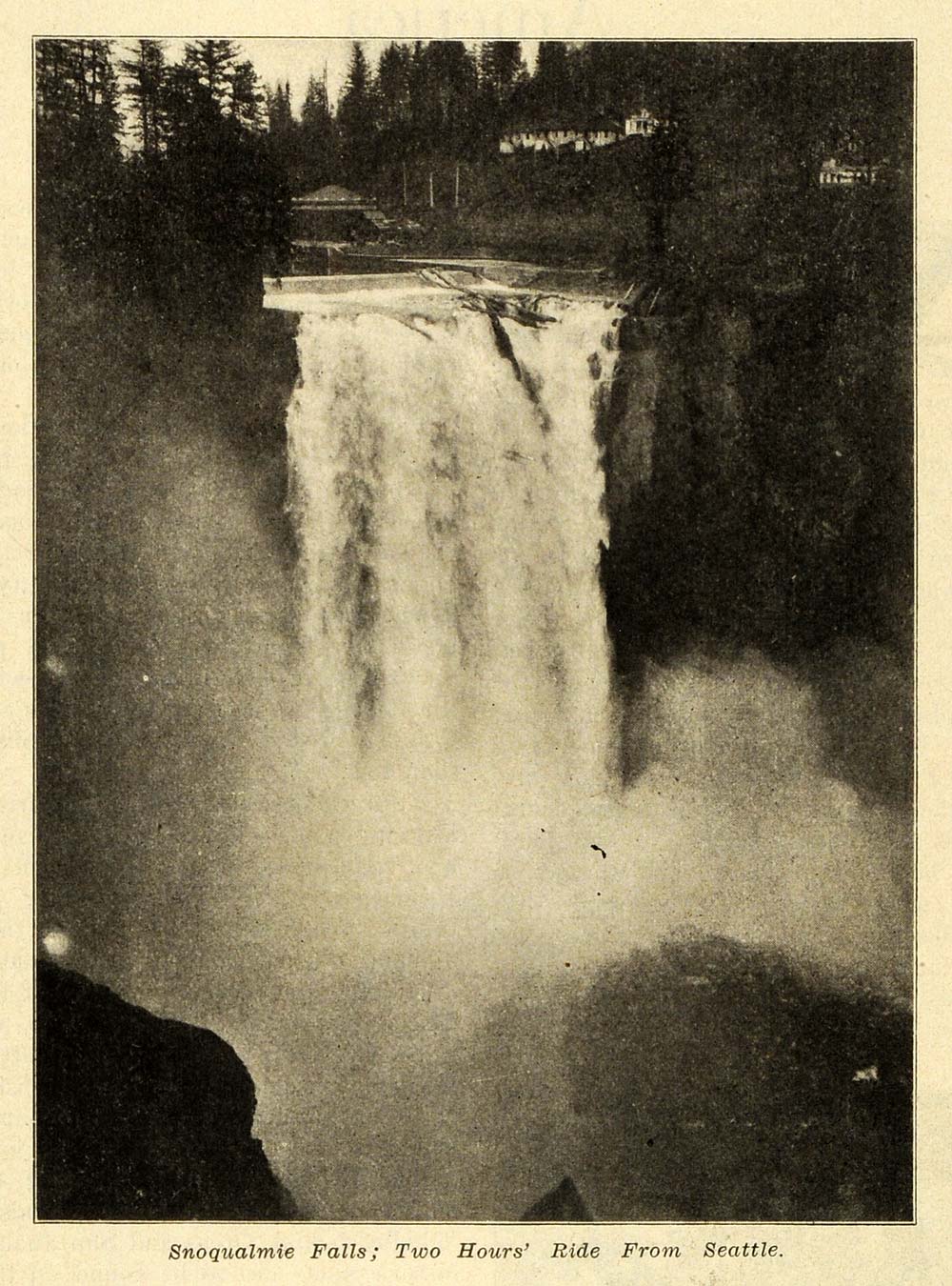 This is an original 1907 halftone print of Snoqualmie Falls located between Snoqualmie and Fall City in Washington. The area is a big tourist attraction, and has 1.5 million visitors annually.