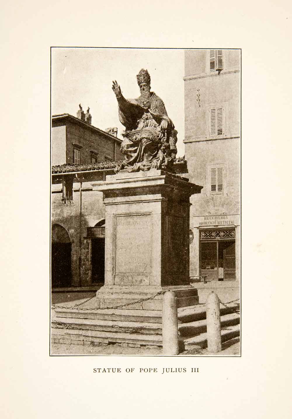 This is an original 1907 black and white halftone print depicting the memorial statue of Pope Julius III, located in Perugia, Italy.