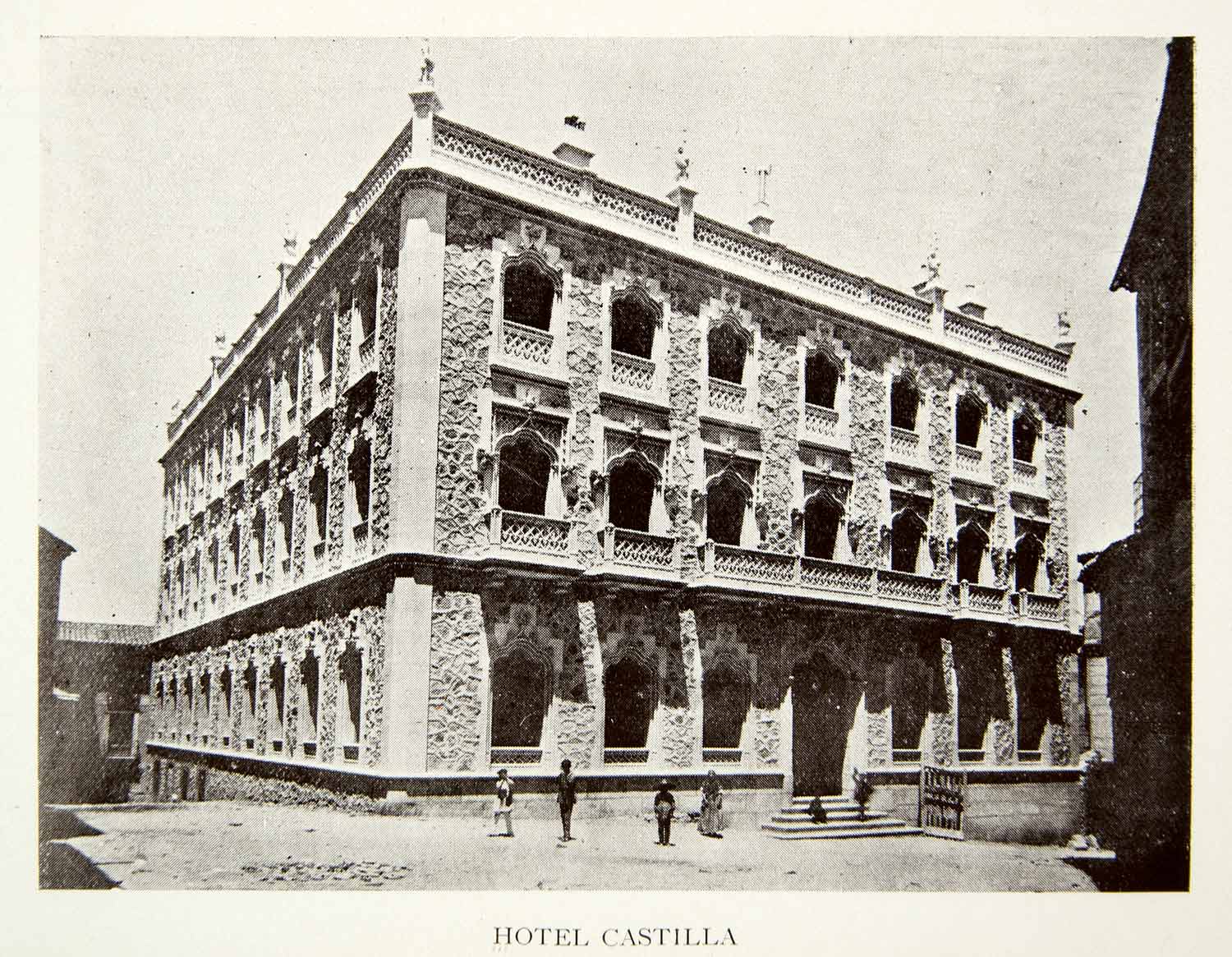 This is an original 1907 black and white halftone print of the Hotel de Castilla in Toledo, Spain, that used to be a prestigious hotel.