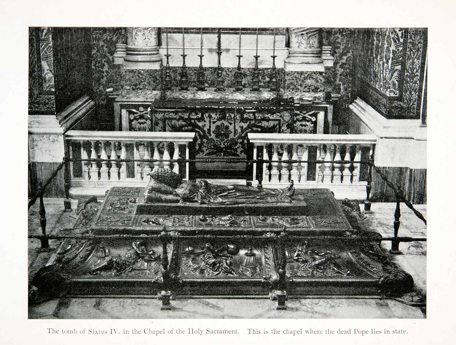 This is an original 1907 black and white halftone print of the tomb of Sixtus IV in the Chapel of the Holy Sacrament. This chapel is where the dead Pope lies in state.
