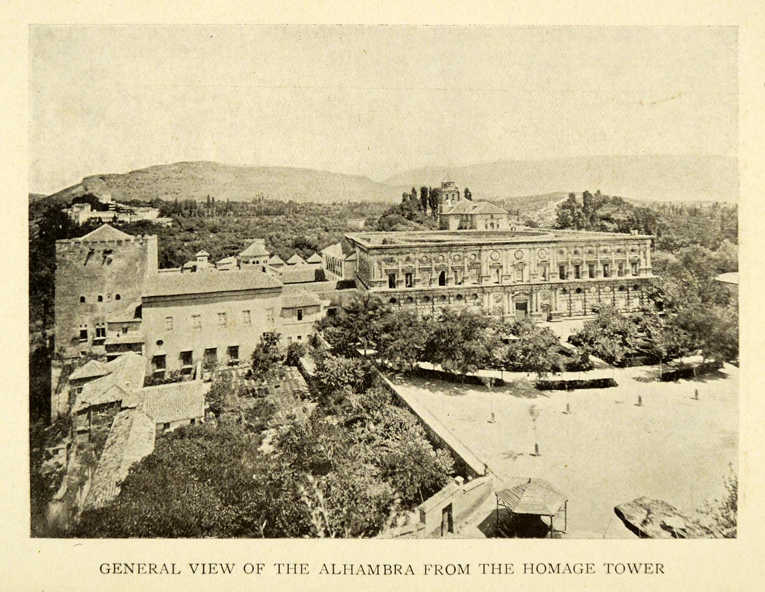 This is an original 1907 halftone print of the general view of the Alhambra from the Homage Tower.