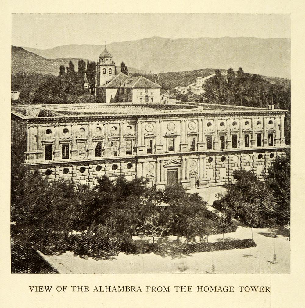 This is an original 1907 halftone print of a View of the Alhambra from the Homage Tower in Granada, Spain.