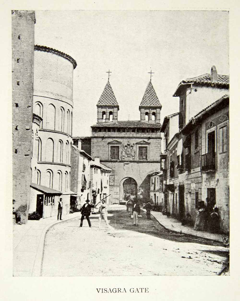 This is an original 1907 black and white halftone print of the Puerta de Bisagra Nueva gate in Toledo, Spain. In the image, you can see the coat of arms of Charles V in the center.
