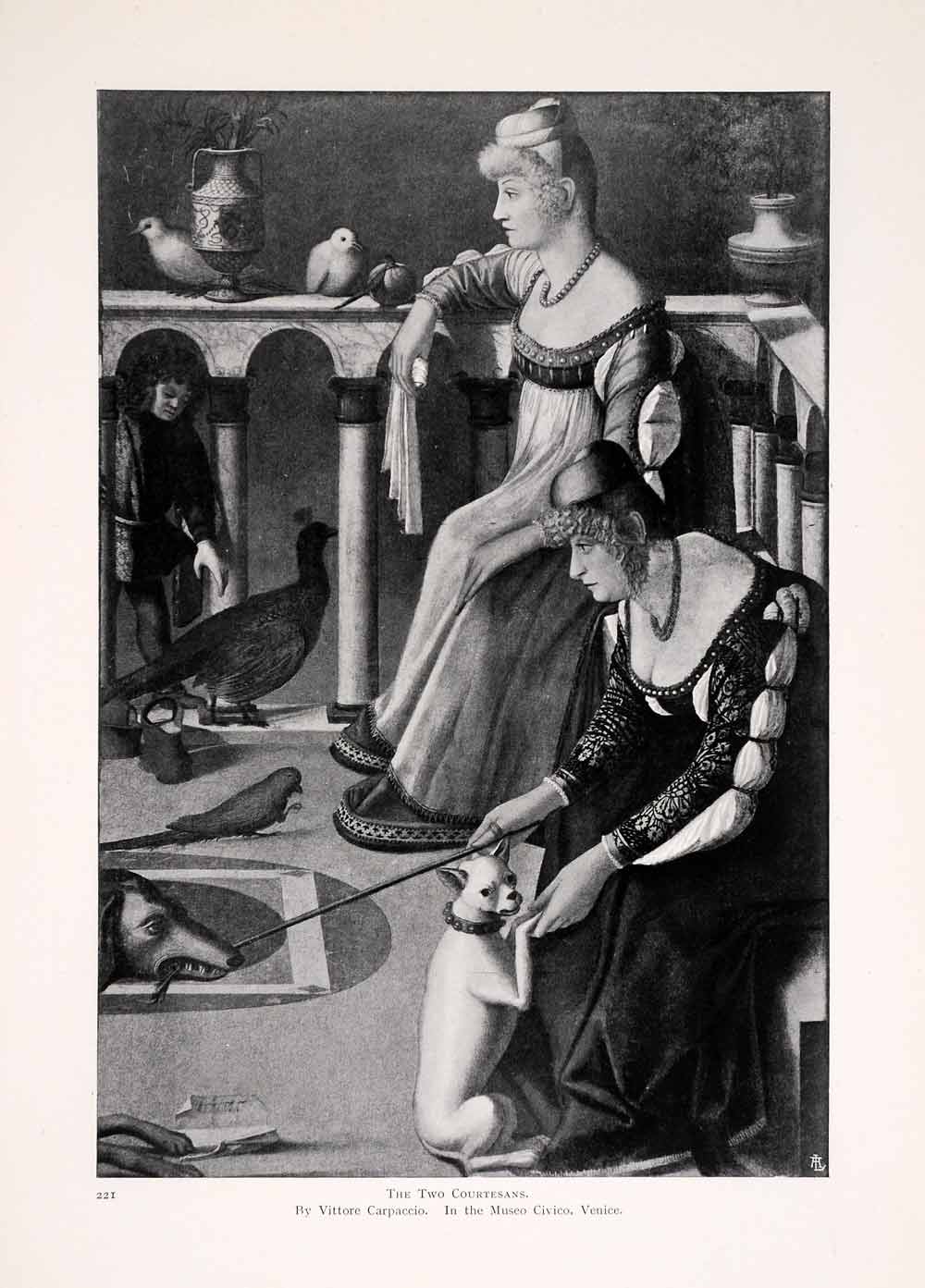This is an original 1907 halftone print of a piece by Venetian Renaissance artist Vittore Carpaccio (c. 1465-1525), who is best known his conservative, large-scale detachable wall-paintings, which were not as humanistic in nature as the work of his other Italian contemporaries. As might be expected, this particular work is reputed to be only a quarter of the original, and depicts two elegant Venetian woman who appear to be watching something in the distance. On the left side are a pair of unusual platform clogs, or