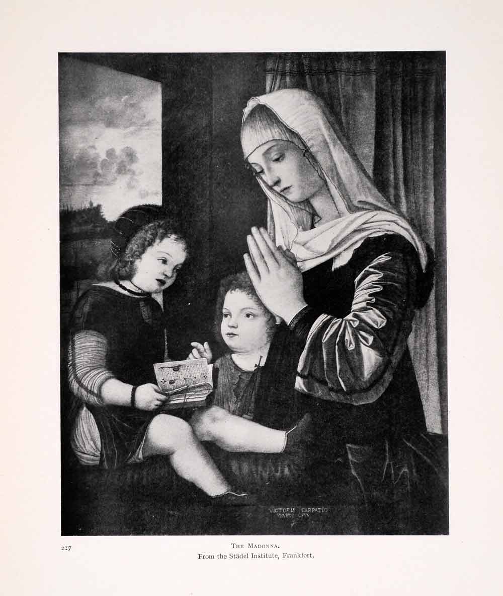 This is an original 1907 halftone print of a piece by Venetian Renaissance artist Vittore Carpaccio (c. 1465-1525), who is best known his conservative, large-scale detachable wall-paintings, which were not as humanistic in nature as the work of his other Italian contemporaries. In this composition, rather than produce a conventional Madonna, Carpaccio preferred to portray her simply as a reverent mother watching over his small boy.