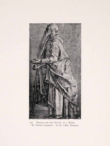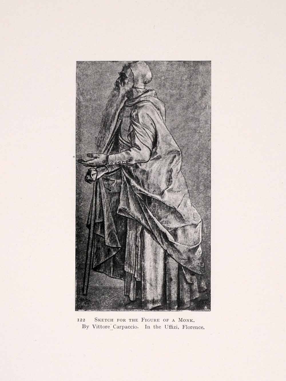 This is an original 1907 halftone print of a sketch by Venetian Renaissance artist Vittore Carpaccio (c. 1465-1525), which depicts an elderly monk.