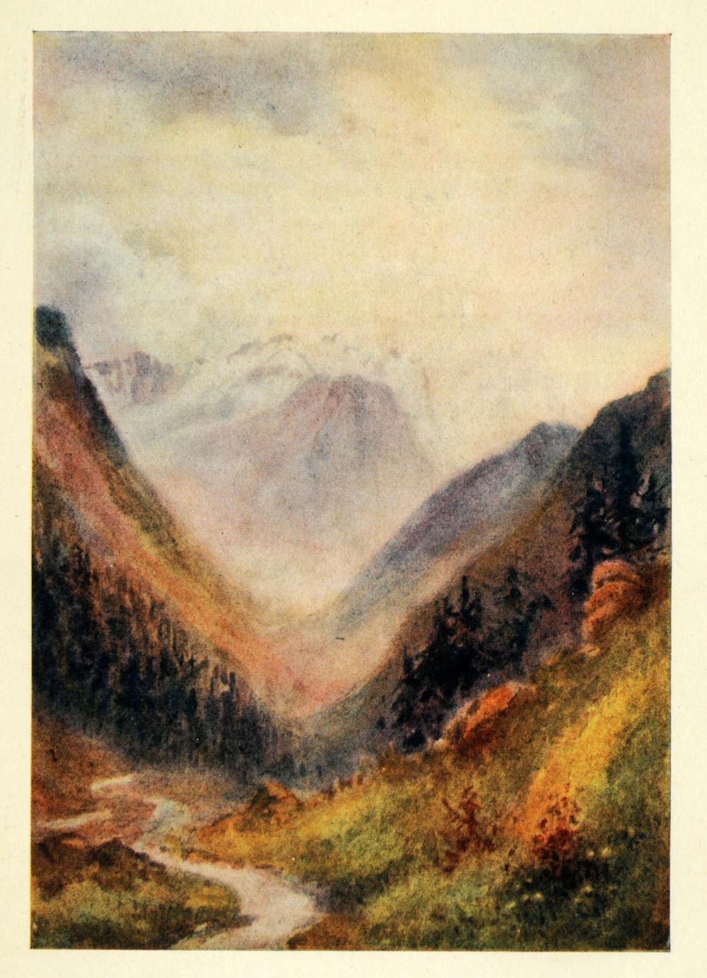 This is an original 1907 color print of the Wetterhorn, located in the Swiss Alps near the village of Grindelwald. The mountain was first ascended in 1854, and marked the beginning of the "Golden Age of Alpinism." This view is from the Engstlenalp.