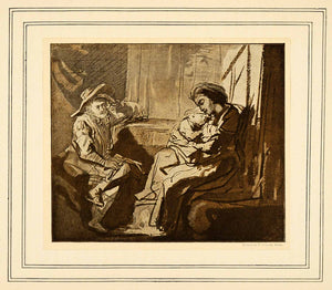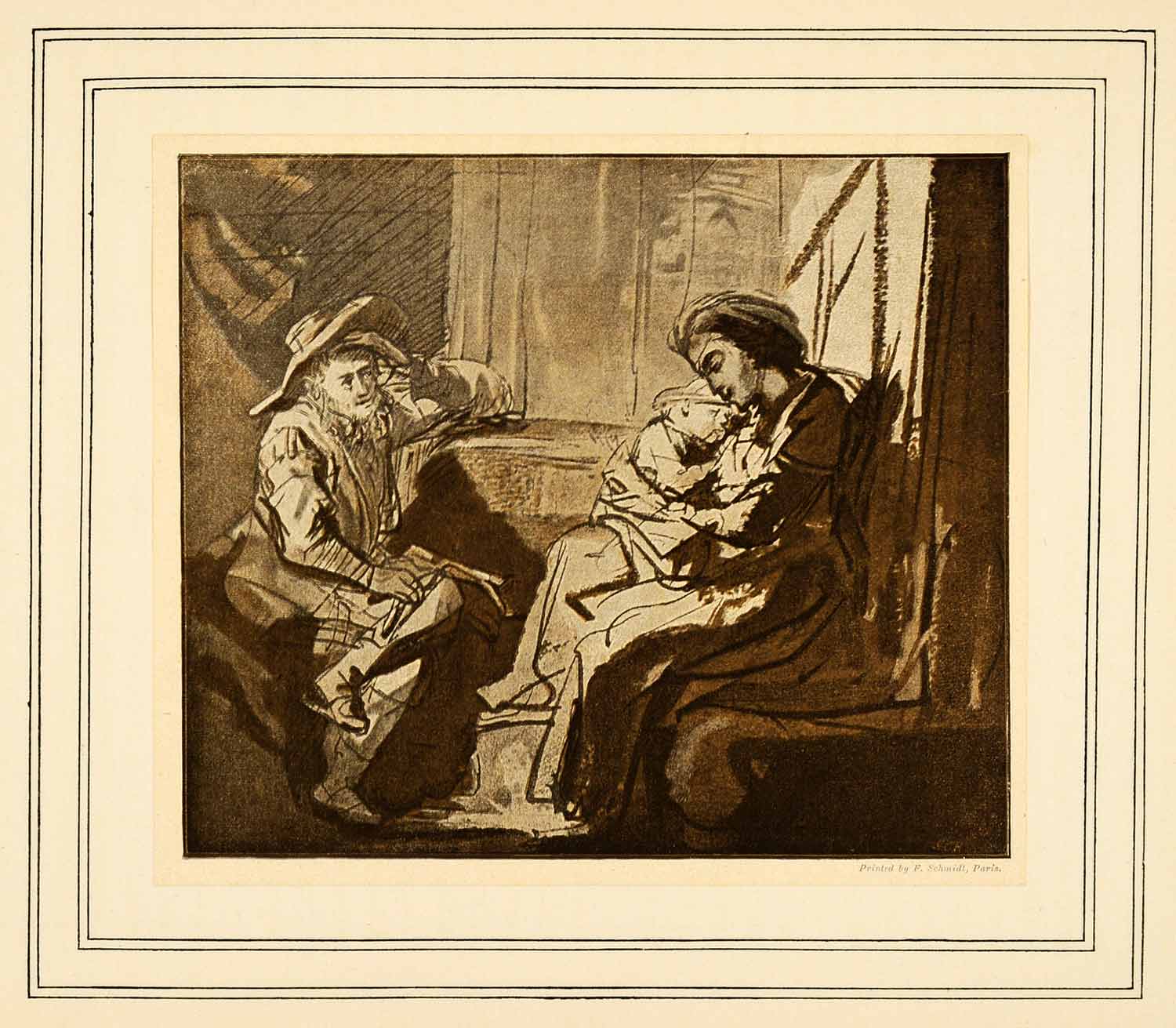 This is an original 1907 tipped-in color print of a man watching a woman with a sleeping child in her arms. The original was created by Rembrandt Harmenszoon van Rijn. Rembrandt was a Dutch painter and etcher. He is considered one of the greatest printmakers in European art history and the most important in Dutch history. His contributions to art came in a period of great wealth and cultural achievement that historians call the Dutch Golden Age.