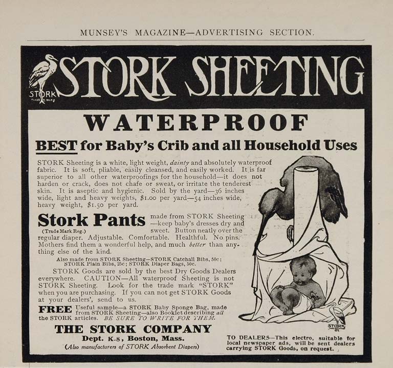 This is an original 1907 black and white ad for Stork Waterproof Sheeting and Pants for babies, from The Stork Co., Boston.