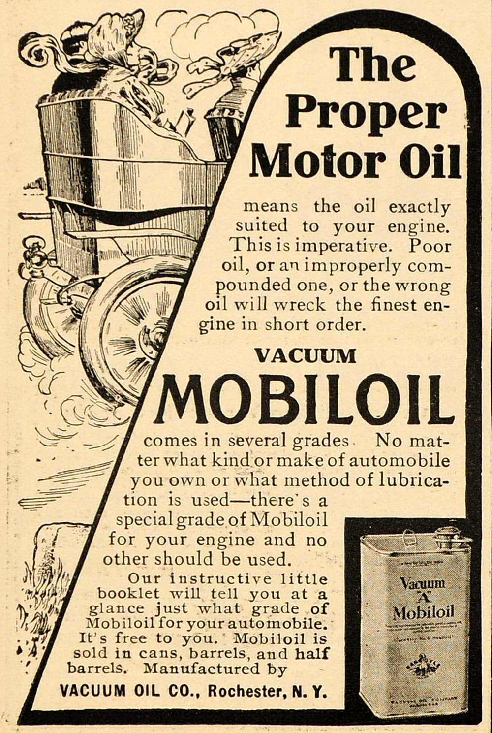 This is an original 1907 black and white print ad for Mobiloil from the Vacuum Oil Co. of Rochester, N. Y.