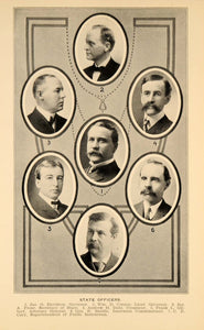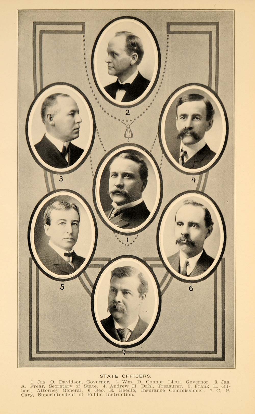 This is an original 1907 halftone print of Wisconsin State Officers: Jas. O. Davidson, Governor; Wm. D. Connor, Lieut. Governor; Jas. A. Frear, Secretary of State; Andrew H. Dahl, Treasurer; Frank L. Gilbert, Attorney General; Geo. E. Beedle, Insurance Commissioner; and C. P. Cary, Superintendent of Public Instruction. (Please note that there is no printing on the reverse of this image.)