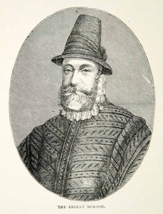 This is an original 1907 black and white in-text wood engraving of the James Douglas, 4th Earl of Morton who served as Regent during the minority of King James VI of Scotland.