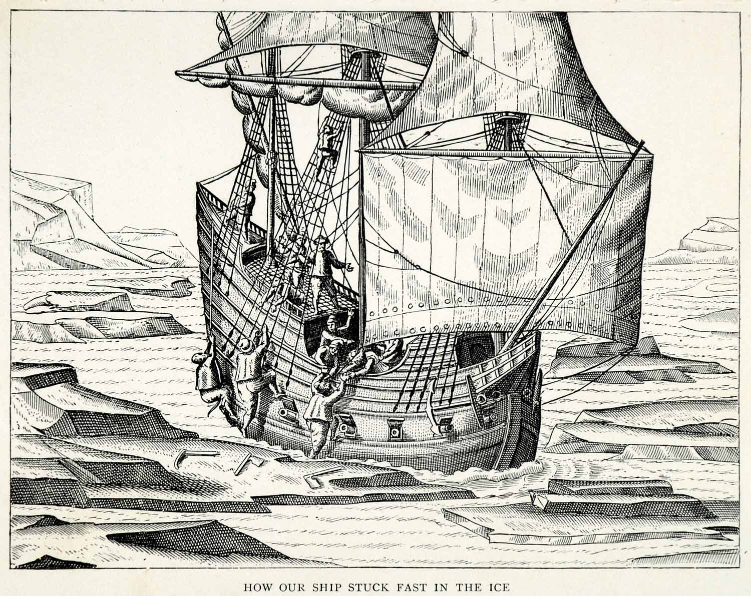 1907 Wood Engraving Ship Glaciers Iceberg Arctic Crew Ice Expedition XGV8
