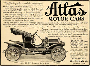 This is an original 1908 black and white print ad for Atlas Motor Cars, specially featuring the Runabout automobile.