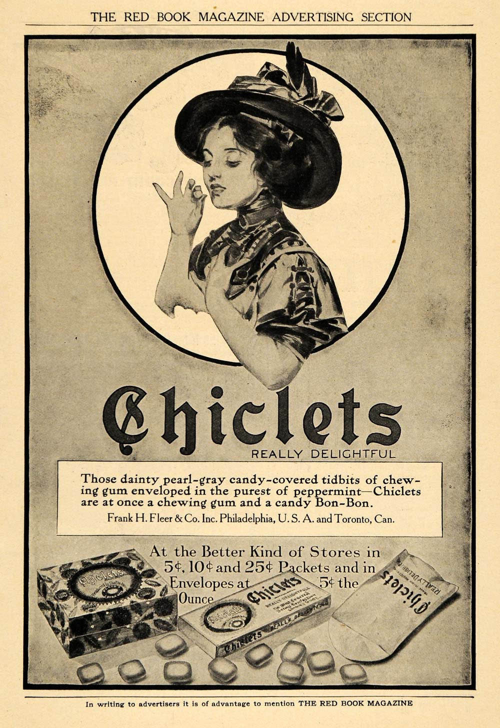"The dainty mint covered candy coated chewing gum," from Frank H. Fleer & Co. Inc., Philadelphia and Toronto. Chiclets is made by Cadbury Adams, a Kraft foods brand.