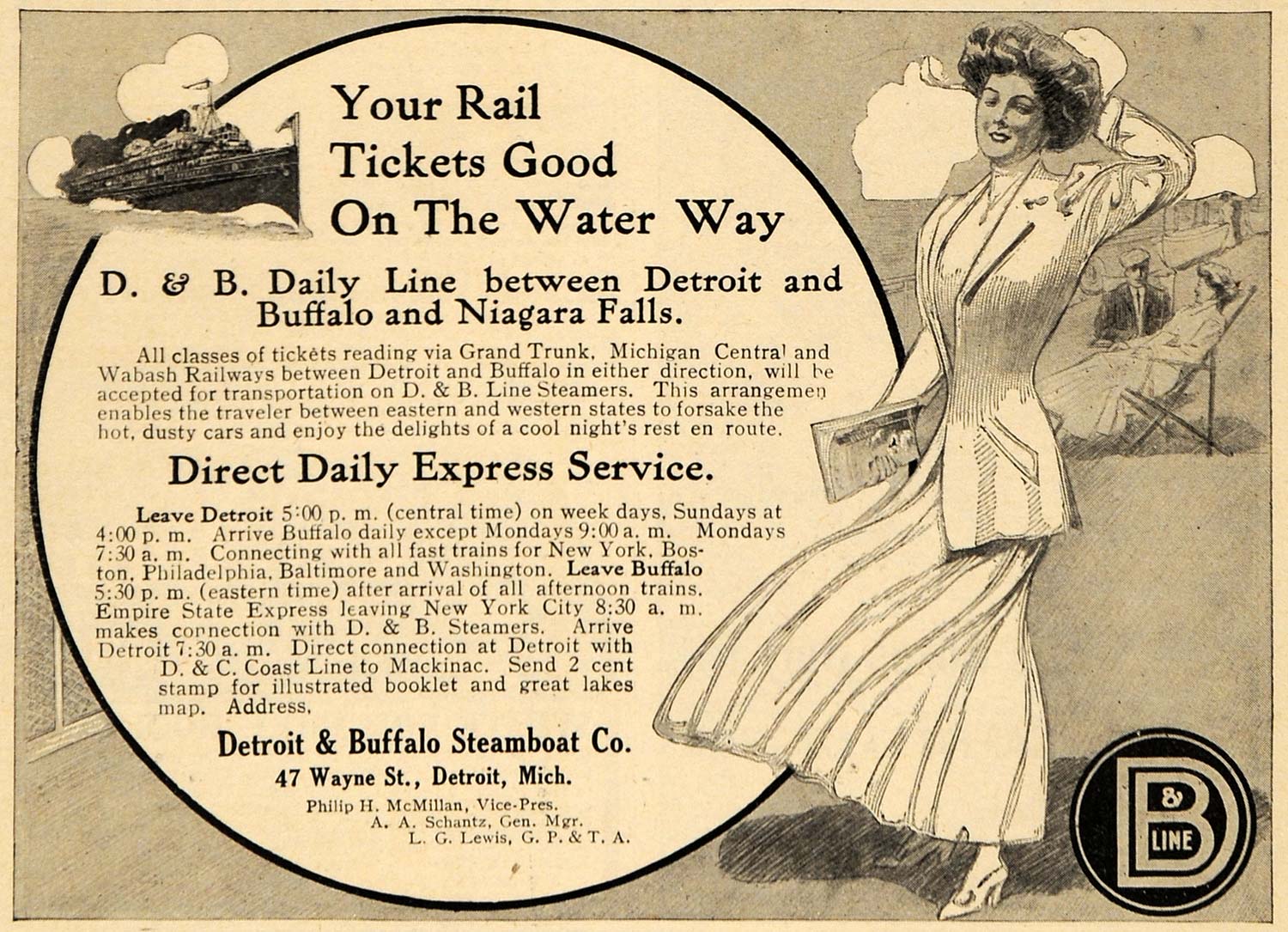 This is an original 1908 black and white print ad for the D. & B. daily line between Detroit and Buffalo and Niagara Falls. Detroit & Buffalo Steamboat Company is located at 47 Wayne Street, Detroit, Michigan.