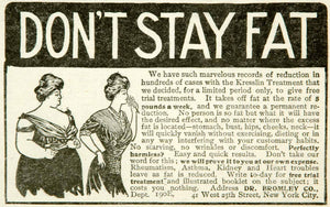 This is an original 1908 black and white print ad for the Kresslin weight loss treatment that was made and sold by the Dr. Bromley Company of 41 West 25th Street, New York, NY during the Edwardian era.