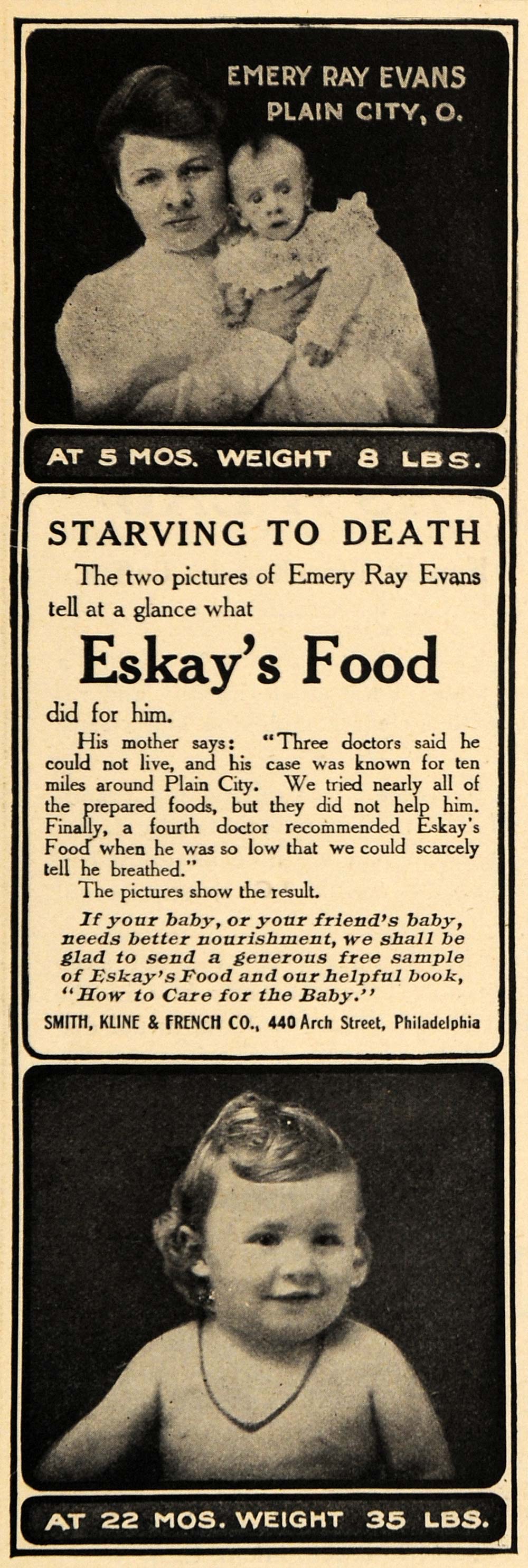 This is an original 1908 black and white print ad for Eskay's Food by Smith, Kline & French Company located at 440 Arch Street, Philadelphia. This ad has a picture of a starving baby, Emery Ray Evans of Plain City, Ohio, with the help of Eskay's Food he became a healthy child.