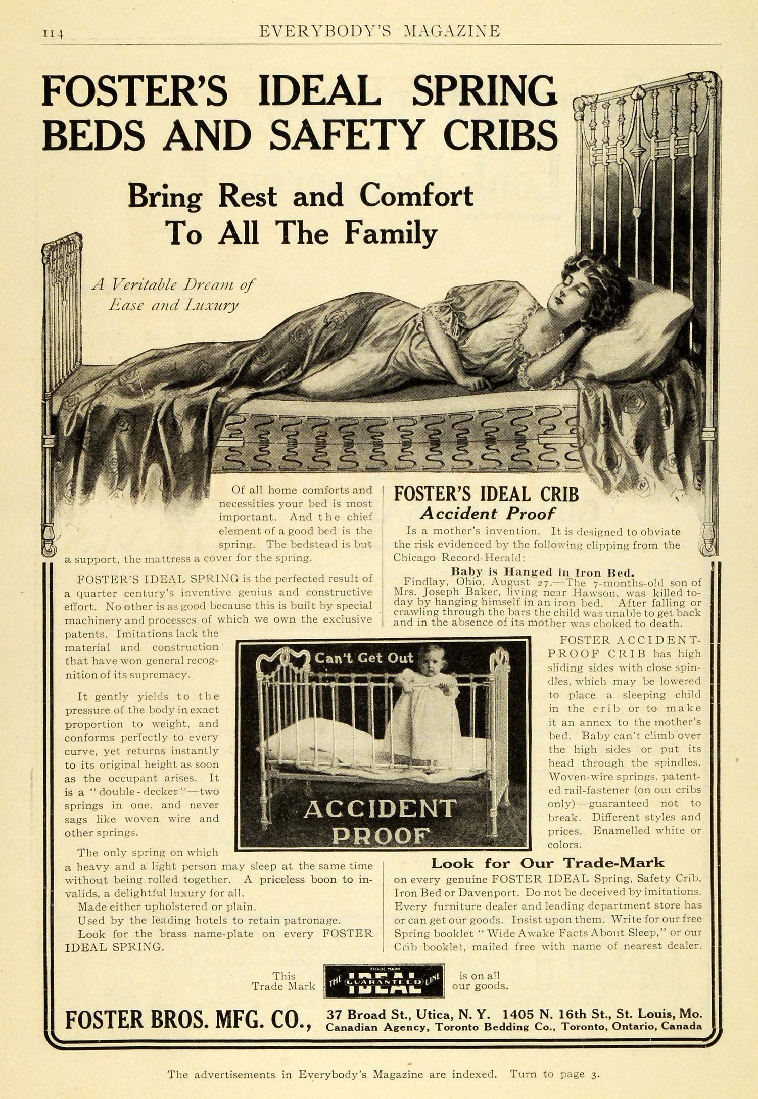 This is an original 1908 black and white print ad for Foster's Ideal Spring Beds and Safety Cribs that are accident proof. Foster Bros. Manufacturing Company is located at 37 Broad Street, Utica, New York and 1405 N. 16th Street, St. Louis, Missouri/