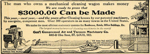 This is an original 1908 black and white print ad for the General Compressed Air and Vacuum Machinery Company, located at 4483-B on Olive Street in St. Louis, Missouri. This ad features the company's mechanical cleaning wagons, the machine that makes money!