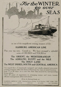 This is an original 1908 black and white print ad for steamship travel aboard one of the cruising steamers of the Hamburg-American Line, Hamburg-American Building, 41-45 Broadway, New York City.